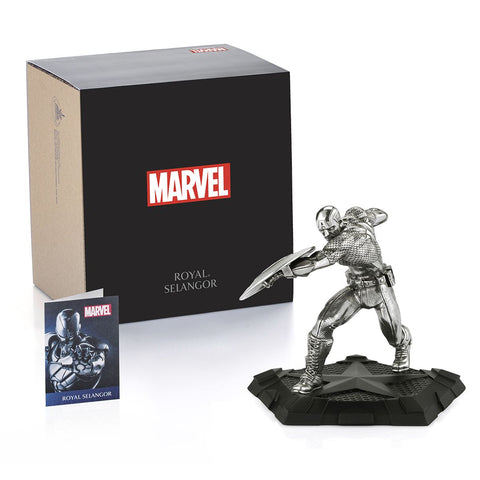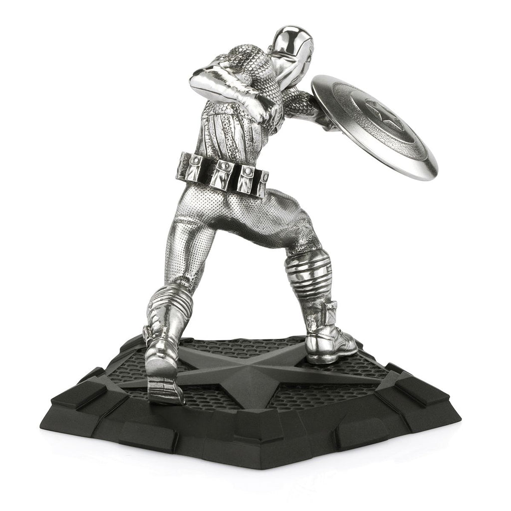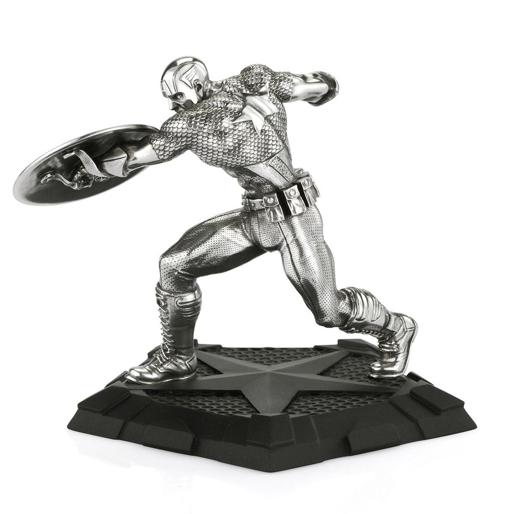 Shield in hand, Captain America charges forward and readies to throw a devastating punch in one fluid move, the sculpture rendered in the dynamic style and distinctive costume of the Bronze Age of comics. The First Avenger’s plinth echoes his signature five-pointed star insignia.